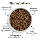 Turkey 32.5% (17.5% freshly prepared, 15% dried), Dried Sweet Potato (26%), Dried Peas, Gelatine, Chicken Fat, Dried Beet Pulp, Dried Fruit (2.3%: apples, pears, blueberries, cranberries), Brewer’s Yeast, Salmon Oil (1%), Botanicals (0.6%: fennel, nettle, dandelion), Mannan‑oligosaccharide, Egg Powder, Chicory Extract, Dried Seaweed, Camomile, Flaxseed Oil, Glucosamine (300mg/kg), Chondroitin Sulphate (300mg/kg), Yucca Extract.