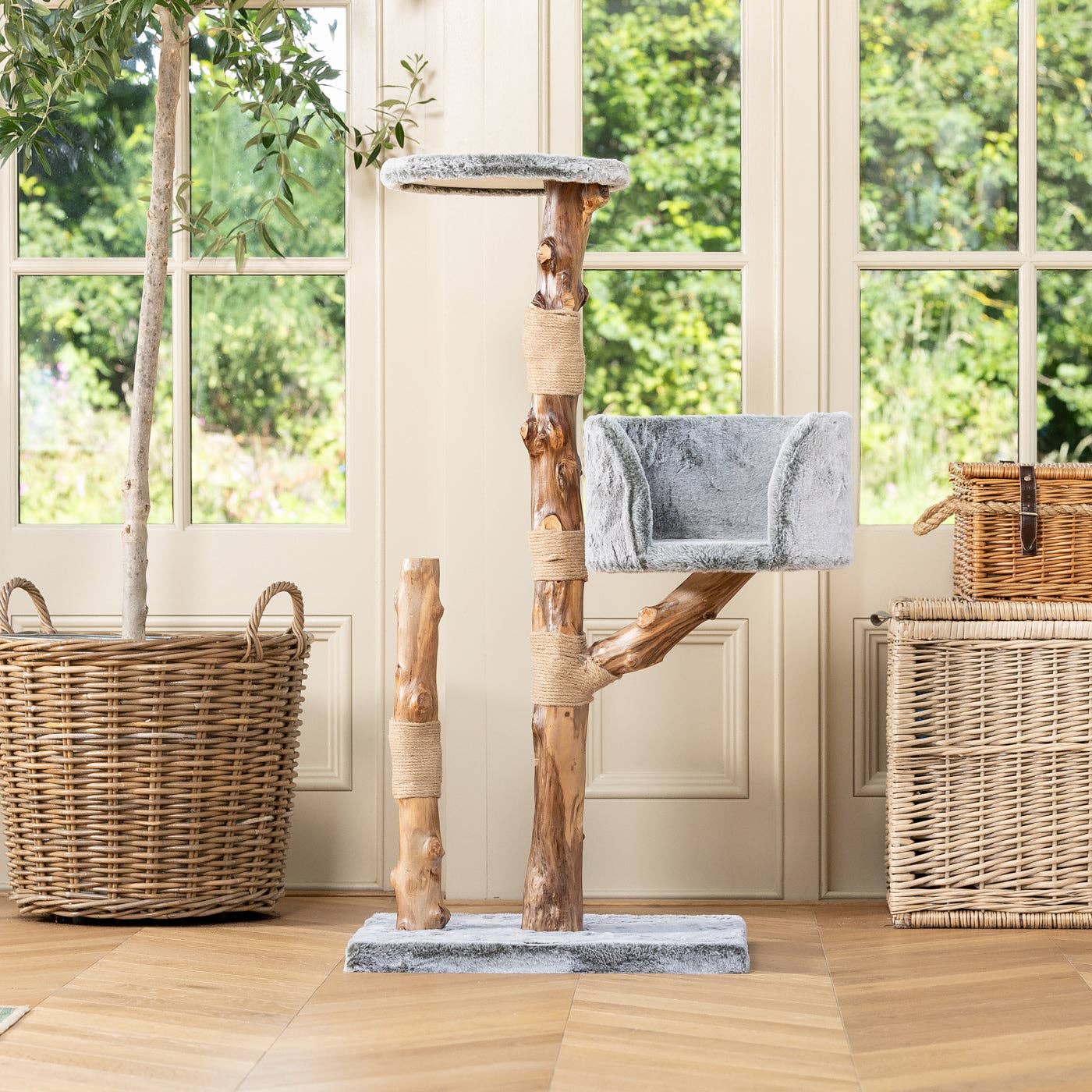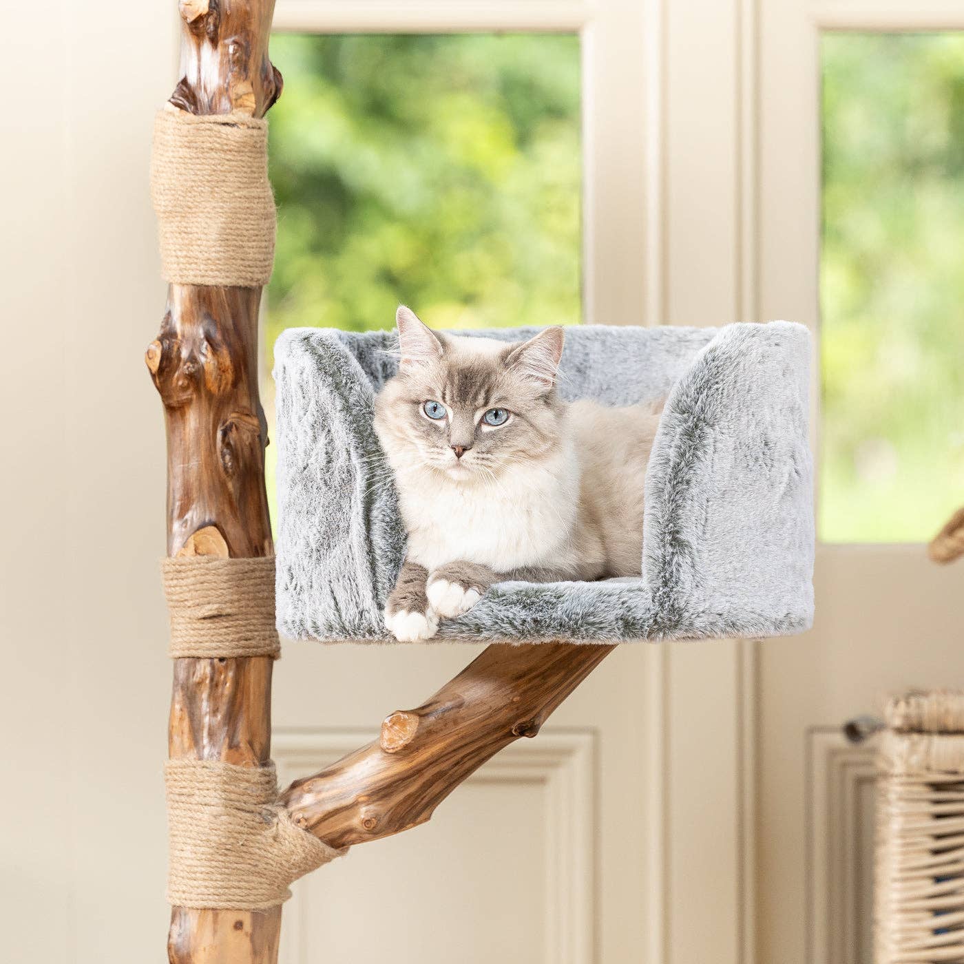 No need to compromise between durability and design – the thick, natural wood branches provide sturdy scratching surfaces and lasting strength, while the look-out platform and high-sided perch create inviting spaces for climbing, lounging, and keeping an eye on their kingdom.